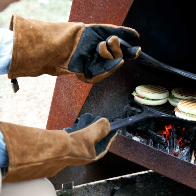 焚き火、BBQ、キャンプストーブ、室内ストーブ、暖炉など、屋内外問わず火を扱う作業が安全に行えるようデザインされたレザーグローブ。
